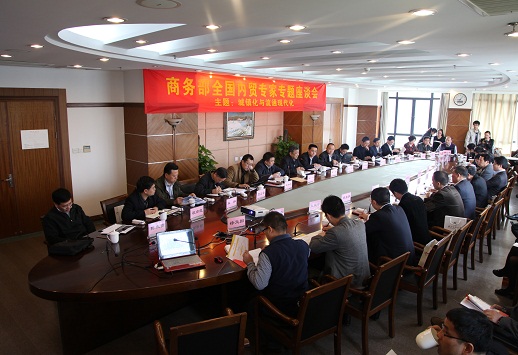 2013年4月10日-4月13日,主题为“城镇化与流通现代化”的商务部全国内贸专家专题座谈会于浙江工商大学召开。商务部内贸专家委员会主任黄海、商务部政研室副主任吴频、商务部市场建设司副司长邓立、浙江工商大学校长张仁寿、浙江工商大学副校长李金昌、浙江省商贸业联合会会长吴德隆、商务部杭州特办副特派员刘德成、商务部杭州特办处长陈庆赟、商务部政研室贸易处处长周岚、商务部流通发展司副处长武传亮、中国社科院财经战略研究院副院长荆林波、国务院发展研究中心社会发展部研究员周宏春、上海财经大学教授晁钢令、上海市商务发展研究中心主任朱桦、上海大学商学院教授李骏阳、首都经贸大学教授祝合良、广东商学院教授王先庆及现代商贸研究中心部分研究员参加了座谈会。本次座谈会由浙江工商大学主办,现代商贸研究中心承办。