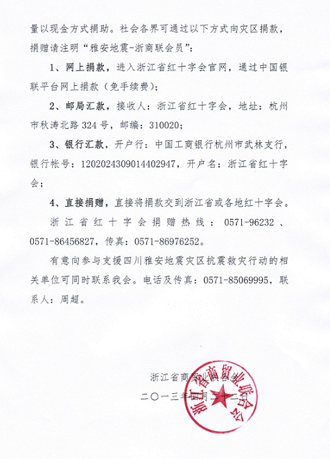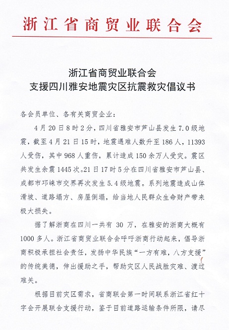 浙江省商贸业联合会支援四川雅安地震灾区抗震救灾倡议书