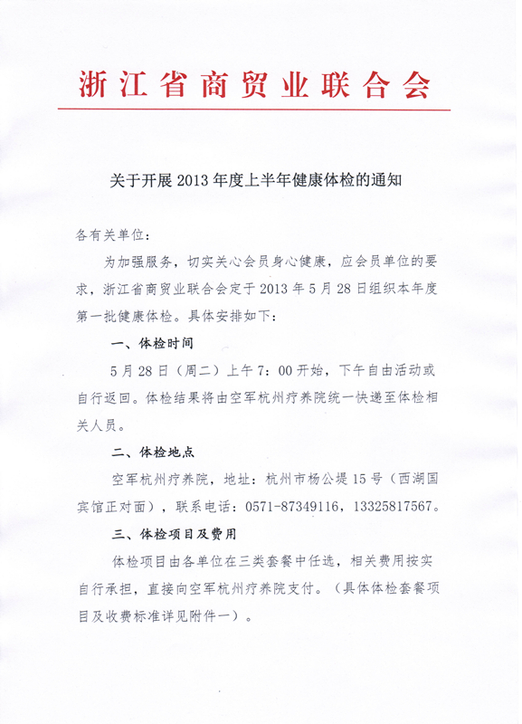 为加强服务,切实关心会员身心健康,应会员单位的要求,浙江省商贸业联合会定于2013年5月28日组织本年度第一批健康体检。具体安排如下: