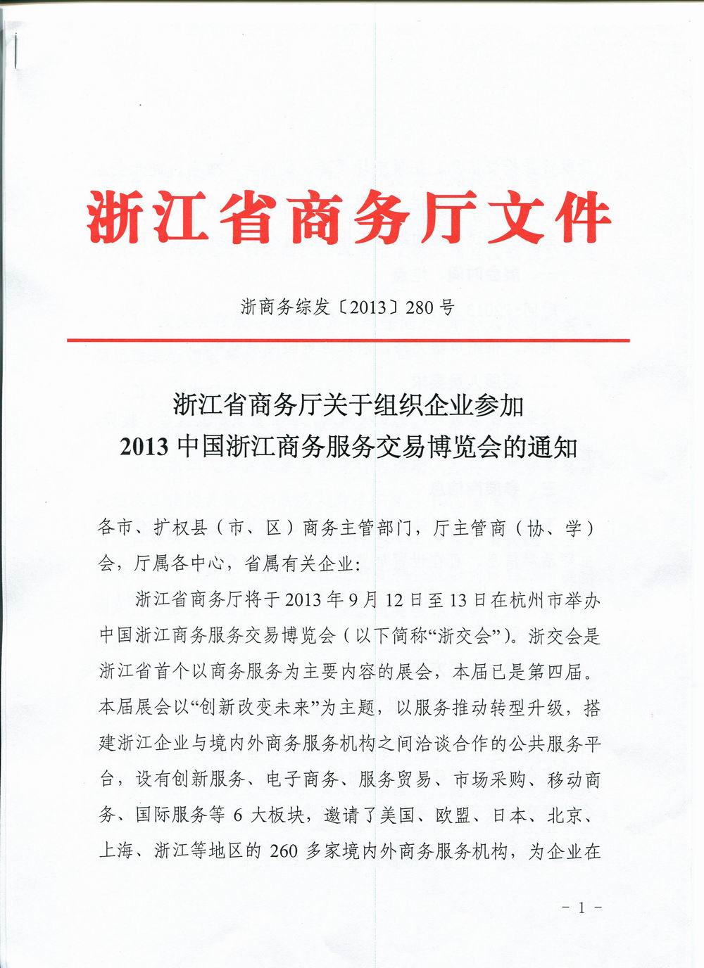 浙江省商务厅关于组织企业参加2013中国浙江商务服务交易博览会的通知