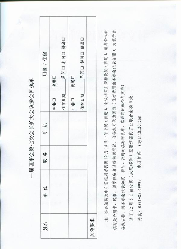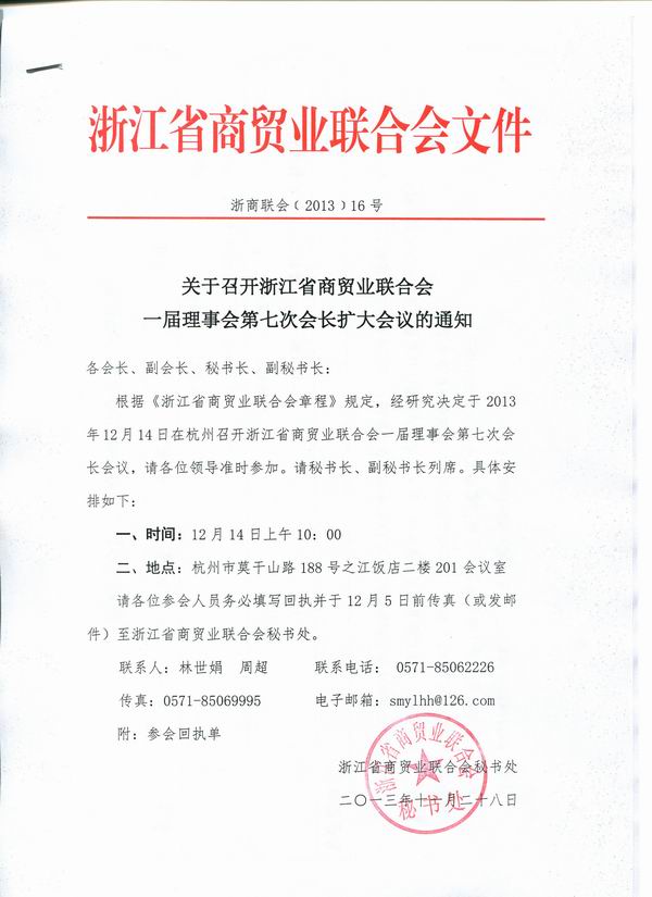关于召开浙江省商贸业联合会一届理事会第七次会长扩大会议的通知