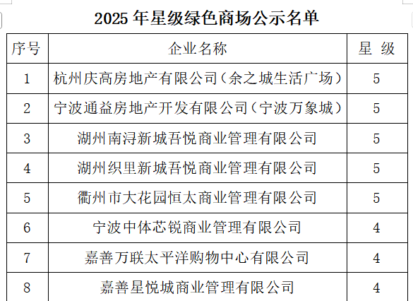 为深入贯彻落实绿色发展理念,推动商场领域节能减排和可持续发展,根据《绿色商场》(GB/T38849-2020)国家标准及浙江省商贸业联合会《关于开展星级绿色商场认定工作的通知》,按照“自愿申报、优中选优、动态管理”原则,2025年在全省会员单位中开展了星级绿色商场认定工作。2025年11月12日省商联会组织评审组对申报企业节能管理、节水管理、垃圾分类与处理、绿色采购、环保宣传、绿色创新六大维度进行评审。经综合评审,杭州庆高房地产有限公司(余之城生活广场)等8家企业(门店)符合认定条件。现予公示,公示期11月13—17日。公示期内,任何单位和个人如对被公示企业有异议,可通过书面形式向省商贸业联合会反映,单位反映请盖公章,个人反映请署实名。联系人:蔡秀刚,电话:0571—87061987。